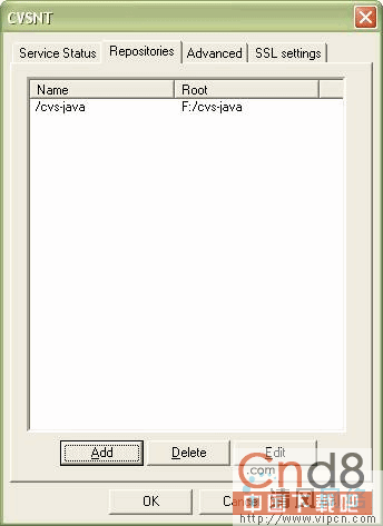 然后切换到Repositories面板,添加一个Repository,命名为/cvs-Java,CVSNT会提示是否初始化这个Repository,选择是: