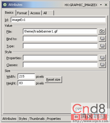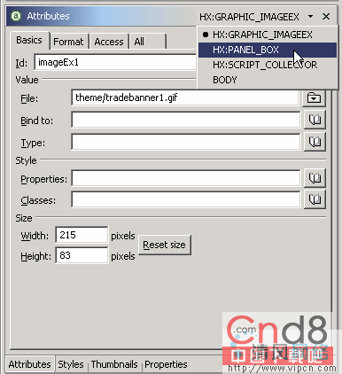 两个图像之间将会有一个不必要的空白区。可以通过编辑面板框的属性来解决这个问题。回到属性框,我们需要显示面板的属性。由于图像是位于面板中的,所以我们可以利用如图 23 所示的下拉箭头来选择面板并编辑它的属性。选择 HX:PANEL_BOX,如下所示。