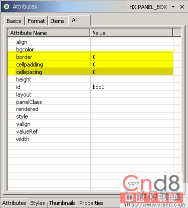 选择 All 标签 (图 24)。输入 border、cellpadding 和 cellspacing 的值 0。