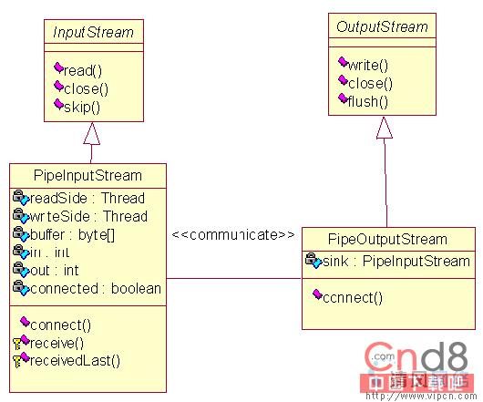 JDK中,类PipeInputStream(即前面所述的B)与PipeOutputStream(即前面所述的的A)可以很好的解决这一问题。首先给出类图如下。