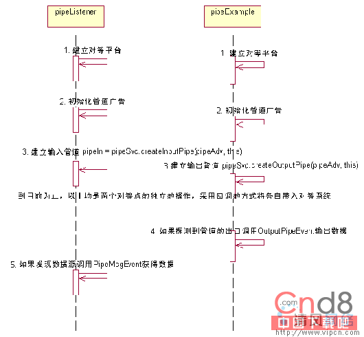 该例中,有两个对等点,并且构建了两个不同的类:一个负责接收(Pipelistener),一个负责发送(PipeExample)。具体的接收次序可以参考时序图: