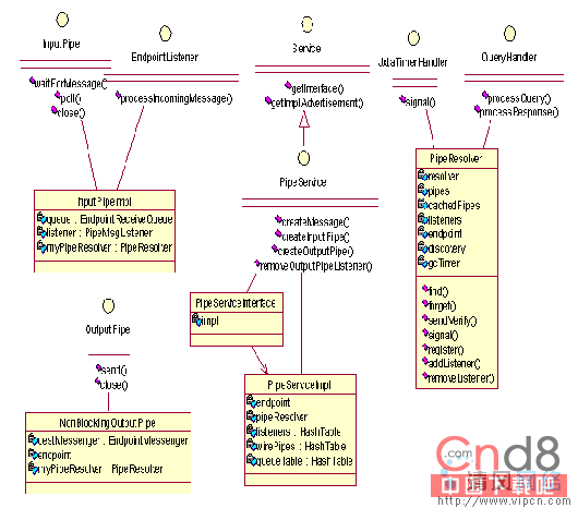 从上面的例程中,可以了解对等管道的创建方法,以及数据流程,但是不能明确对等系统是如何去实现的。JXTA中管道的实现比在JDK中实现要复杂得多,具体的技术标准可以参考对等管道绑定协议(PBP),此协议规范了JXTA中管道的概念,但并没有涉及到如何去实现,这同样是所有JXTA协议的特征。它们的目标是阐述what it is,而把how to do it留给开发者,这样有利于增强系统的开放性。其中Java参考实现,就是该协议实现的一个案例,以下将具体分析。