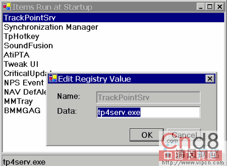 作为演示,请在示例项目的主窗体上单击 Work with the Registry(使用注册表)按钮。此窗体提供了 SOFTWAREMicrosoftWindowsCurrentVersionRun 项的 HKEY_LOCAL_MACHINE 配置单元中所有注册表值的列表。您可以右键单击列表中的任何项,然后选择插入新项,或者编辑或删除选定项,如图 1 所示。