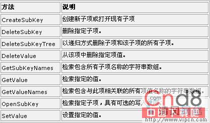 另一个类是 RegistryKey,它可以完成所有工作。它提供了一组使用 Registry 的方法。表 1 列出了 RegistryKey 类的所有有用方法。
