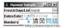 图示1显示了Spinner伴随不同的输入类型是什么样子。图示1的顶端的JSpinner是一个用来显示法语星期,通过SpinnerListModel。中间的,是一个通过SpinnerDateModel显示日期的JSpinner。底部的是使用SpinnerNumberModel的JSpinner。每一个都是通过各自神秘的方式,在本文的后面我们将要学习。