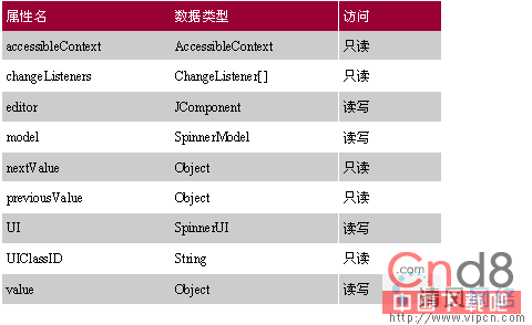 除了创建JSpinner对象之外,你还可以通过表一中的九个属性中的一个来进行配置。