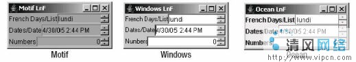 同所有的Swing控件,JSpinner在不同的系统定义look-and-feel类型下,拥有不同的外观,如示图2。这个控件期初看起来像一个textfield,不同点是绘制了两个箭头。