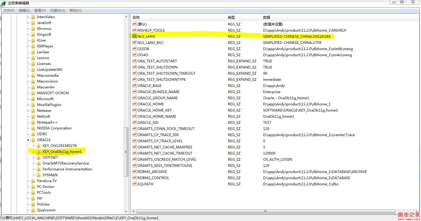 在注册表的:NLS_LANG=SIMPLIFIED CHINESE_CHINA.ZHS16GBK 如下图: