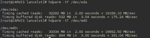 使用hdparm -tT 设备名称 来测试,分别测试/dev/sda和/dev/md0,测试结果如下