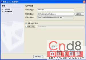 在这个对话框中需要设置项目的名称以及项目所在目录,我为自己的项目起名为JUnitTest,“项目位置”为G:YPJCCKJUnitNetBeans,此外,请将“创建主类”前的对号去掉。项目创建好后,已经自带了JUnit 3.8.1。