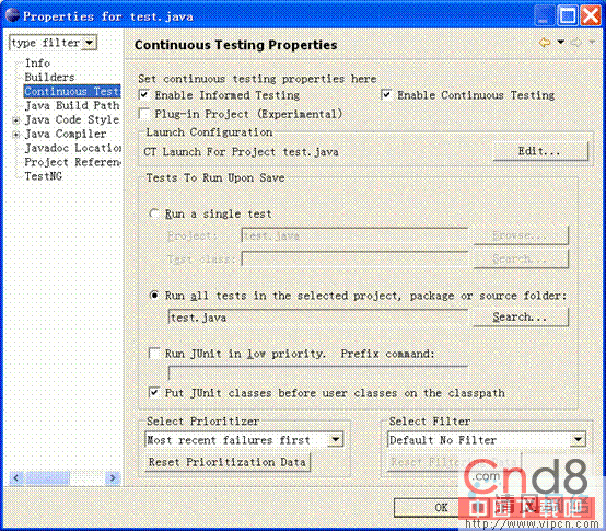 在这个对话框中,我们还可以配置Continuous Testing的一些设置信息。例如寻找Test Case的策略、进行测试的优先级设置以及在测试开始之前进行过滤操作等。例如我就喜欢让Continuous Testing优先测试最近出错的测试。