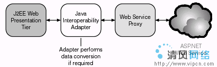 互用性适配器调用该代理,然后代理调用 Web 服务。该适配器还必须在任何 Java 数据和基于 XML 架构的正确字符串/XML格式之间进行转换。