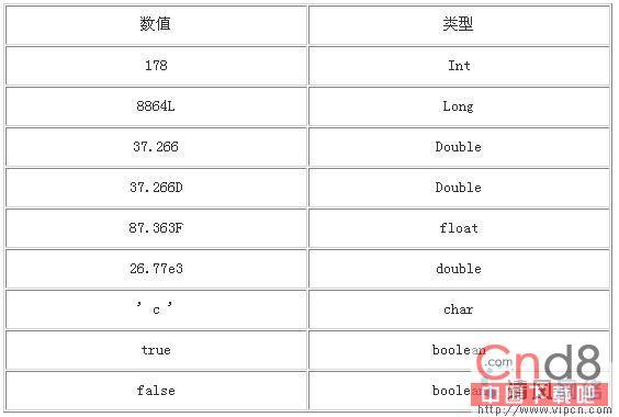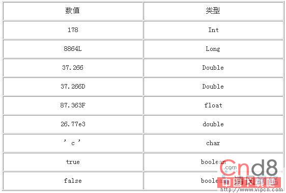 总得说来,没有小数点的数就是整型。你可以通过在数字后面加一个'L' 或者'l'指定为一个长整型。一般使用'L'而不使用'l',因为'l'很轻易与数字'1'混起来。有小数点的数为双精度类型。你可以在数字后面放置'f' 或者 'F'来指定为实数。而字符型数值可以是处在单引号中间的任何单一的Unicode字符;两个布尔型数是true和false。