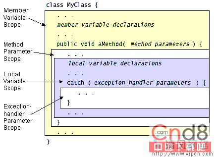 变量的作用域是一个程序的区域,在上面变量可以通过它的名字来引用。其次,作用域也决定什么时候系统为变量创建和清除内存。作用域只应用成员变量并决定是否变量可以从所在类的外部使用。在程序中变量声明的位置建立它的作用域并且将它放置到以下四类之一:
