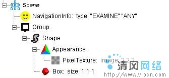 X3D中,提供了PixelTexture(像素纹理)、ImageTexture(贴图纹理)和MovieTexture(影像纹理)三个节点。对于MovieTexture(影像纹理)节点,我们将在后面的"多媒体效果"中再做具体讨论,这里仅讨论前面两个基本纹理节点。