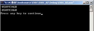 从图中可以看到,输出了两个很大的负数。这是因为在构造pt对象时,系统要为它的成员变量x和y分配内存空间,而在这个内存空间中的值是一个随机值,在程序中我们没有给这两个变量赋值,因此输出时就看到了如图2.10所示的结果。这当然不是我们所期望的,作为一个点的两个坐标来说,应该有一个合理的值。为此,我们想到定义一个初始化函数,用它来初始化x和y坐标。这时程序的代码如例2-6所示,其中加灰显示的部分为新添加的代码。