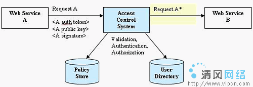 典型的访问控制系统需要处理验证和授权任务。基于不同的配置方案,系统可以接受许多种类的信用标记。对于Web服务访问控制系统,除其他需求外,非凡地需要支持不同的基于Web服务安全的方案。系统需要从输入的Web服务信息头部的WS-Security信息部分提取并使用用户信用标记来验证请求者。另外,如图2所示,访问控制系统还需要能够修改输入的请求信息,如添加额外的安全头部信息,添加特定的验证标记和签名,以及进行消息解密等。