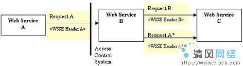 在请求信息到达目的Web服务节点前,目的节点前端的访问控制系统需要对请求信息进行特定的安全处理。非凡的处理包括首先进行的消息验证(消息结构和完整性),以及签名验证和对任何加密内容的解密等。在我们的实现中Web服务的请求输入点上应该是(可能)附带已经验证的WS-Security头部信息的有效SOAP信息,以及头部附加的特定验证标记。在图3中Web服务节点B处,工具包应该协助开发者从(请求A的)输入中提取验证标记,构造新的(位于请求B中的)Web-Security标记,或为了满足目标系统(Web服务节点C)的策略需求而改变已有(请求A中包含的)信用标记。