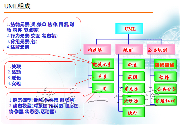 UML组成,三部分(构造块、规则、公共机制),关系如下图所示: