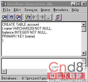 7、 选择IBConsole的菜单Tools -> Interactive SQLhttp://school.cnd8.com/java/jiaocheng/UploadFiles/20071231/200815223834918778016..,在Interactive SQL-accounts窗口上部的文本框中,输入下面的建立数据库表的SQL语句: