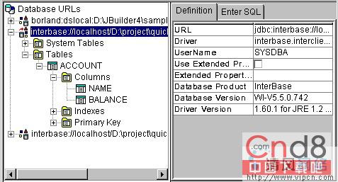 展开"interbase://localhost/D:projectquickstartACCOUNTS.GDB",点击"Tables"下的ACCOUNT表。在右边窗格选择Data标签。你将看到程序所创建的新的四行数据。