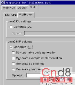 2、 在弹出窗口中,选择"Build"标签,再选择"VisiBroker",然后仅仅选择"Generate IIOP"。如图16。
