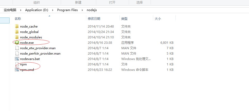 先去nodejs官网http://www.nodejs.org/download/下载对应的版本,我的是64位的。下载好后直接安装,由于现在的版本已经到v0.10.33了,所以node跟npm已经一起安装了,连环境变量也设置了,安装好后可以在对应的文件夹看到如下