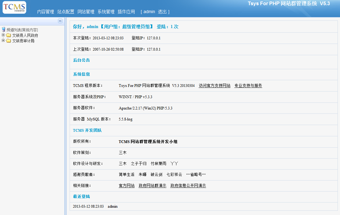 tsys for php cms , 一个免费开源的政府网站群内容管理系统,运行在apache+mysql+php环境,可用此系统实现政府网络群模式管理网站,政府信息公开、互动办事平台等。谢谢!