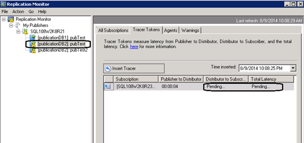 declare @publisher sysname declare @publicationDB sysname declare @publication sysname set @publisher='SQL108W2K8R22' set @publicationDB='pubdb' set @publication='pubdbtest2' select transaction_timestamp From MSreplication_subscriptions where publisher=@publisher and publisher_db=@publicationDB and publication=@publication