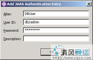 在 Alias 字段中键入 DBUser。在 User ID 和 PassWord 字段中键入 db2admin(或者键入任何您要在创建数据库时使用的密码)。