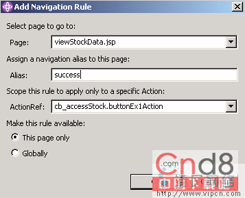 选择 viewStockData.jsp 作为 Page 的值。在 Alias 字段中键入 sUCcess(它也是由操作处理程序返回的)。在 ActionRef 字段中选择 cb_AccessStock.buttonEx1Action。