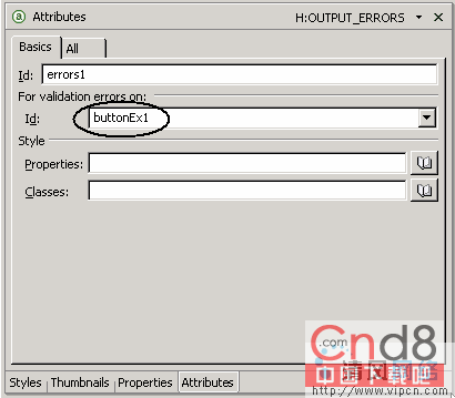 选中输出组件,然后切换到 Attribute 视图。在 For validation errors on 项的 Id 字段中选择 buttonEx1。