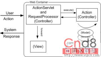 在Struts 架构中,Controller主要是ActionServlet,但是对于业务逻辑的操作则主要由Action、ActionMapping、ActionForward这几个组件协调完成。其中,Action扮演了真正的业务逻辑的实现者,而ActionMapping和ActionForward则指定了不同业务逻辑或流程的运行方向。