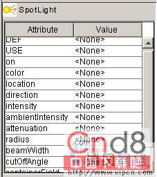 其中大部分属性与PointLight节点含义相同,所不同的有:
