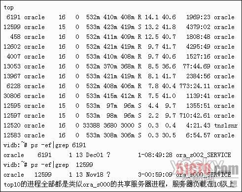 如果用户请求数大于共享服务器进程数,那么肯定有请求是在排队,假定目前一个共享服务器进程正在执行一个长事务,那么请求队列就要一直等,直到当前的事务结束。从用户请求的角度看,很明显,响应的时间加长了。从服务器角度看,我们先看一下由网友 WESTLIFE_XU 提供的实例: