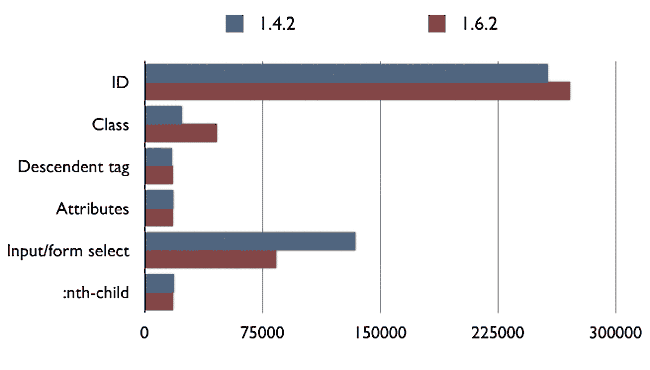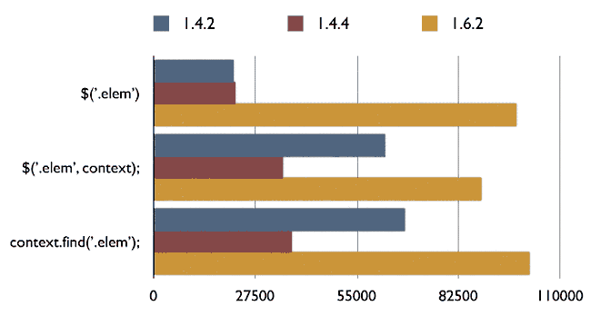 我们用1.4.2、1.4.4、1.6.2三个版本的jQuery测试,看看浏览器在1秒内能够执行多少次。结果如下: