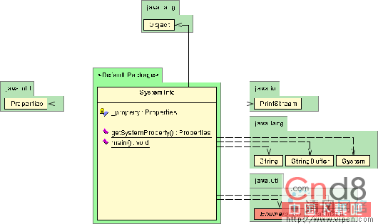 设计SystemInfo类,用来获取系统的属性,并打印输出到标准输出。首先我们将设计一个getSystemProperty()方法,该方法将调用java.lang.System.getProperties()返回一个系统属性列表,在main()函数中,将系统属性的要害字和属性描述放到一个Hashtable结构中,通过遍历这个结构,获取系统属性值。类结构图如下: