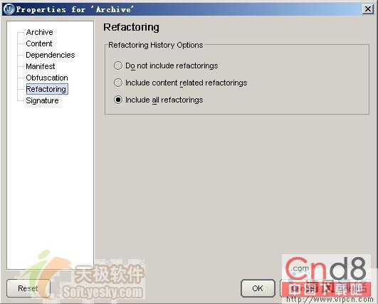 假如common_lib工程资源树中已经有了一个打包节点,仅需右击该节点在弹出菜单中选择Properties更改打包的设置即可,在弹出的Properties for ‘Archive’选择Refactoring设置页,如下图所示: