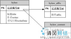 在下面我们列举一个使用SQL Server数据库进行事务处理的例子。主表是一个规章制度信息表(bylaw),主要字段有记录编号、标题、作者、书写日期等。两个子表分别是附件表(bylaw_affix)和文本信息表(bylaw_content)。表结构见图1所示。bylaw表的记录编号与bylaw_affix表的记录编号、bylaw_content表的记录编号是对应的,每次对规章制度信息的操作也就是对这三个表的联合操作。例如要删除规章制度中的一条记录,假如不使用事务,就可能会出现这样的情况:第一个表中成功删除后,数据库忽然出现意外状况,而第二、三个表中的操作没有完成,这样,删除操作并没有完成,甚至已经破坏数据库中的数据。要避免这种情况,就应该使用事务,它的作用是:要么三个表都操作成功,要么都失败。换句话说,就是保持数据的一致性。所以,为了确保对数据操作的完整和一致,在程序设计时要充分考虑到事务处理方面的问题。