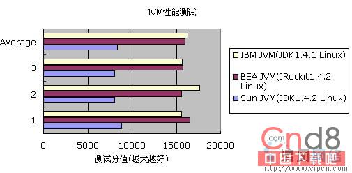 在Linux平台上,Sun的Hotspot性能很一般,不如同样环境下Windows下的Hotspot表现好; IBM的JVM无论在Linux还是Windows平台性能很卓越,不过IBM主要还是把精力放在Linux/Unix平台上,它的Windows平台
