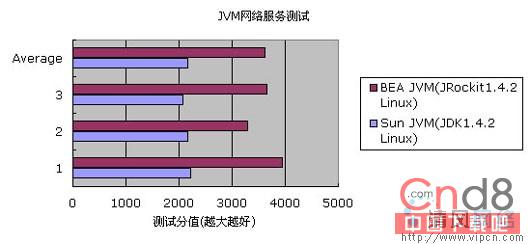 在第二项网络服务测试中,IBM的JVM无法完成测试,会出现段地址错误,JDK版本和glibc版本不兼容造成的。Sun的JVM也需要修改一下JVM参数才可以顺利执行,从测试结果来看,BEA的JRockit仍然遥遥领先于Sun的Hotspot。