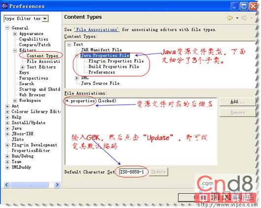 在3.1M6版本下,我们可以直接修改Properties资源文件的默认编码了(Eclipse3.0版本似乎不支持)。在Eclipse主界面下,打开 Window ->Perferences ->General ->Editors ->Context Types: