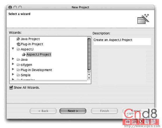 Eclipse 3 Mx版本的缺省设置是隐藏所有附加向导。你可以选中Show All Wizards选择框以显示New AspectJ Project的选项。