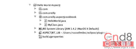 一旦项目向导完成,Eclipse里的工作界面会建议你切换到Java Perspective,并且,假如你是第一次使用这个向导,它会要你确认几个AJDT的引用。推荐使用Java Perspective,并且接受默认的项目参数。完成后你的项目会如图2-2所示。