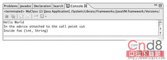 切换回Java perspective,并且运行你的程序。在Eclipse里运行一个AspectJ程序和运行一个普通的Java程序一样简单。在Java perspective里选择包含public static void main(String[] args)方法的类,然后在主菜单里选择Run  Run As  Java Application。Eclipse会在选中的类里查找并执行main()方法。命令行输出结果会显示在Console view里,如图2-7所示。
