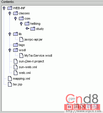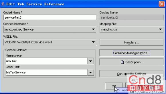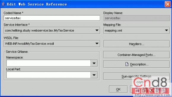 下面解释一下这个描述付。对Web服务的引用通过元素来指定;就是在客户端编程中要使用的引用名字;就是服务接口,有两种,分别是javax.xml.rpc.Service和com.hellking.study.webservice.tax.MyTaxService;是服务的有效名称空间,假如直接使用com.hellking.study.webservice.tax.MyTaxService作为服务接口,就不需要指定元素;就是对服务端点的引用,它引用的是webservices.xml中定义元素。用来链接到webservices.xml中指定的,并且两者的名字是一致的。