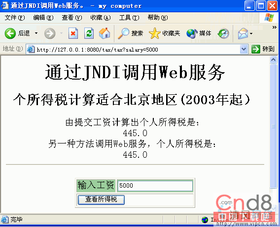可以看出,第一种方法查找的就是MyTaxService接口,而第二种方法查找的是Service接口。具体使用那种方式,是和部署描述相关的,在后面将介绍部署的差别。最后开发一个JSP来作为测试客户端,这个JSP通过JavaBean调用Web服务,如例程9所示。