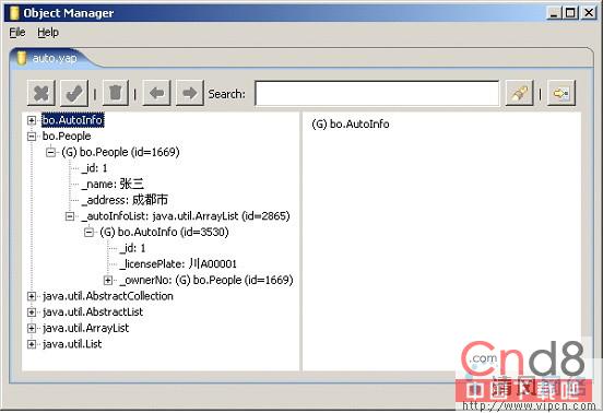打开之后,如图 2 所示,刚才存贮的 People 对象已经在数据库中了,并且还可以很直观的看到 AutoInfo 对象也放入了 ArrayList 中。这种可视化的对象关系有利于我们对数据的理解,是传统 RDBMS 无法比拟的。有些开发者会说 ObjectManager 工具略显简单,这点我想随着 db4o 的不断发展会加入更多的特性。在这个工具中,我们意外的发现了 Java 集合对象的踪影,db4o 把与 ArrayList 有直接关系的所有接口和父类都保存了,这样显得更直观。