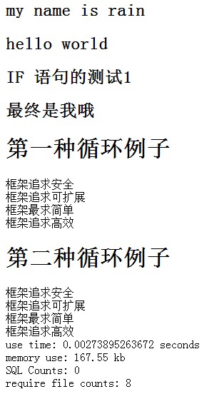 框架使用的模板引擎只是简单的一些正则替换、支持模板编译缓存,目前支持如下的一些模板引擎标记,包括if操作、直接赋值操作、foreach操作、loop操作、include操作,具体说明如下