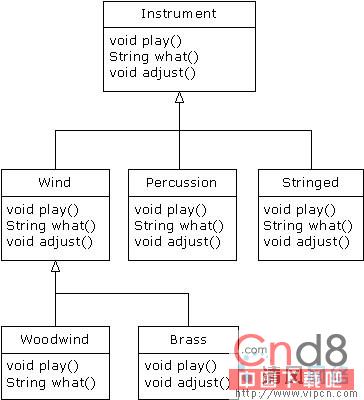 所有这些新类都能与老类――tune()默契地工作,毋需对tune()作任何调整。即使tune()位于一个独立的文件里,而将新方法添加到Instrument的接口,tune()也能正确地工作,不需要重新编译。下面这个程序是对上述示意图的具体实现: